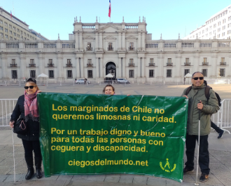 Para que se hagan una idea del lienzo de dos metros por uno y medio, escrito con letras amarillas y fondo verde intenso, expresaba: “Los marginados de Chile no queremos limosnas ni caridad. Por un trabajo digno y bueno para todas las personas con ceguera y discapacidad”.