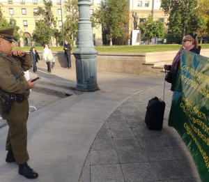 Hicimos una manifestación pacífica se destaca que es la primera en la historia de Chile, en la vallada plaza que da al Palacio de la Moneda, el centro del poder ejecutivo, mucha gente leyó nuestro lienzo, lo leía con atención y lo conversaba en voz baja, seguro que los sensibilizo y será un tema que conversará a otra gente de su círculo de esta situación.